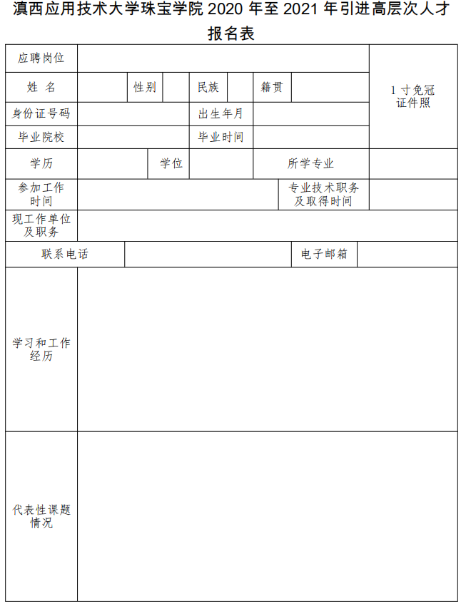 1.報名方式:報名采取網(wǎng)絡(luò)報名的方式進行,應(yīng)聘人員需填寫《滇西應(yīng)用技術(shù)大學(xué)珠寶學(xué)院2020至2021年引進高層次人才報名表》(附件),連同身份證、學(xué)歷學(xué)位證(留學(xué)回國人員須提供教育部認證的材料)、職稱證或職業(yè)(執(zhí)業(yè))資格證、代表性學(xué)術(shù)成果等發(fā)送至學(xué)院人事處郵箱(郵箱地址:zbxyrc5159339@163.com)進行報名(郵件主題統(tǒng)一命名為姓名+應(yīng)聘崗位名稱)。