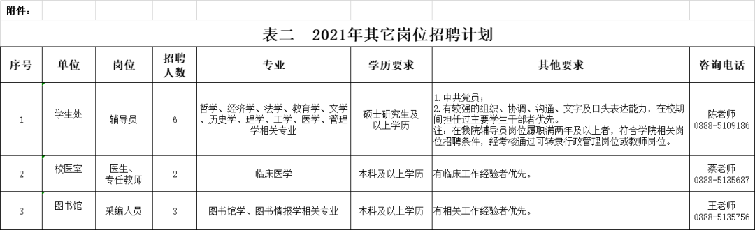 2021年計(jì)劃招聘專任教師103人,輔導(dǎo)員6人,校醫(yī)室醫(yī)生2人,圖書館采編人員3人。詳見(jiàn)招聘計(jì)劃。