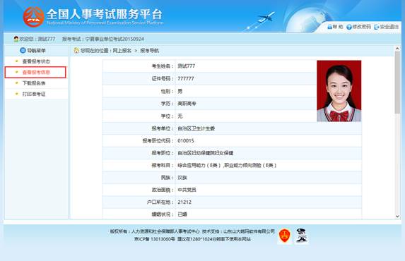 考生可以通過(guò)點(diǎn)擊“查看報(bào)考信息”按鈕,查看考生填寫(xiě)的報(bào)考信息,如下圖所示:
