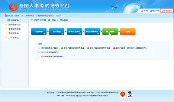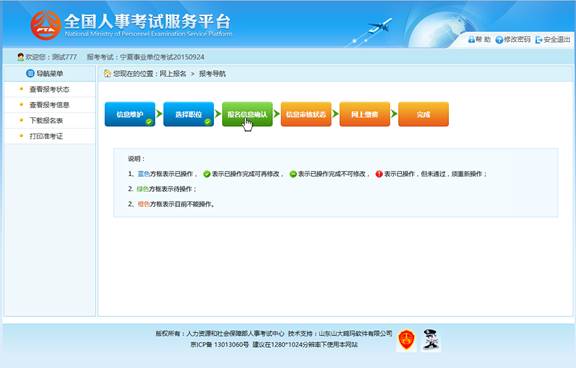 通過(guò)點(diǎn)擊“確認(rèn)”按鈕,提示確認(rèn)成功后跳轉(zhuǎn)到報(bào)考流程頁(yè)面,如下圖所示: