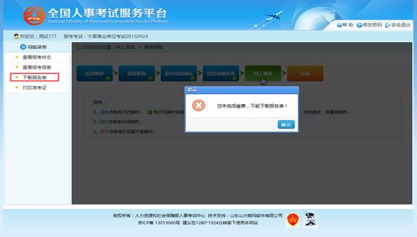 名表”選項(xiàng),系統(tǒng)會(huì)提示“您未完成繳費(fèi)不能下載報(bào)名表”,如下圖所示: