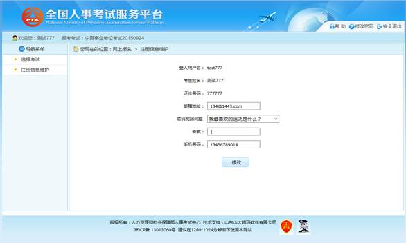 通過(guò)點(diǎn)擊系統(tǒng)導(dǎo)航菜單中“注冊(cè)信息維護(hù)”選項(xiàng),可跳轉(zhuǎn)到修改注冊(cè)信息頁(yè)面,
