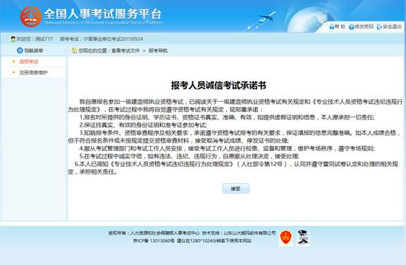 通過(guò)點(diǎn)擊“接受”按鈕,進(jìn)入查看考生承諾書(shū)的頁(yè)面,如下圖所示: