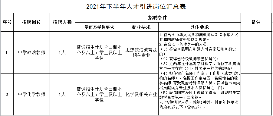 為加強(qiáng)學(xué)校教師隊(duì)伍建設(shè),引進(jìn)優(yōu)秀師資,進(jìn)一步滿足人民群眾對(duì)優(yōu)質(zhì)教育資源的需求,根據(jù)我校教育教學(xué)工作需要,面向社會(huì)引進(jìn)省內(nèi)、外優(yōu)秀中學(xué)政治教師1人、化學(xué)教師1人。通過(guò)人才引進(jìn)的教師解決編制,納入昆明市事業(yè)單位人員管理。現(xiàn)將有關(guān)事項(xiàng)公告如下: