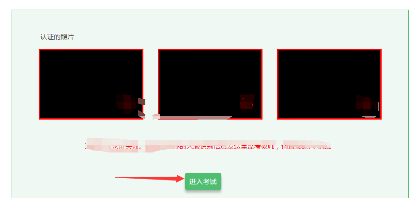 7.點(diǎn)擊“進(jìn)入人臉識(shí)別”,點(diǎn)擊“拍照”。如人臉匹配成功,則可進(jìn)入考試。如人臉匹配不成功,會(huì)提示人臉匹配失敗,三次匹配不成功則自動(dòng)保存異常記錄,監(jiān)考教師會(huì)根據(jù)考生實(shí)際情況判定該生是否可以參加考試,此過(guò)程中考生須全程配合相關(guān)操作,否則不可參加考試。