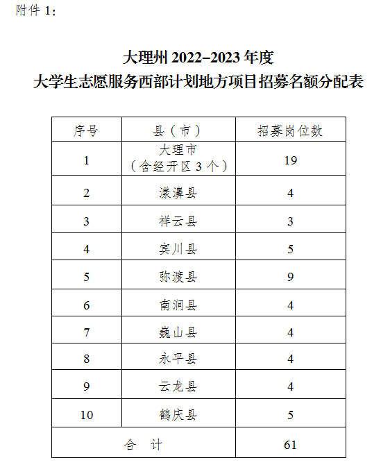 附件:1.大理州2022-2023年度大學(xué)生志愿服務(wù)西部計(jì)劃地方項(xiàng)目招募名額分配表