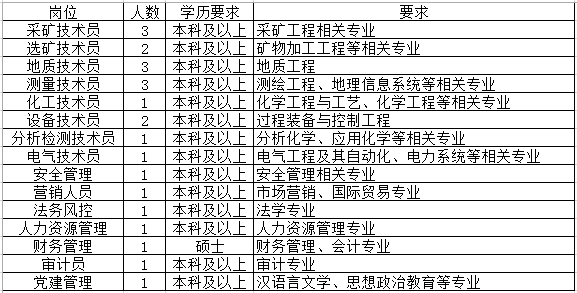 專業(yè)技術(shù)管理人才結(jié)構(gòu):采礦、礦物加工、資源勘查、測(cè)量、機(jī)械工程及其自動(dòng)化、過程裝備與控制、電氣、儀表、自動(dòng)化、企業(yè)管理、會(huì)計(jì)或財(cái)務(wù)管理、市場(chǎng)營(yíng)銷、法律……等。
