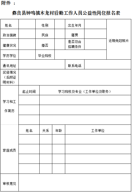 附件:彝良縣鐘鳴鎮(zhèn)木龍村后勤工作人員公益性崗位報名表