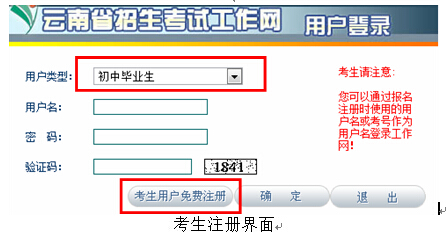 步驟1: 登錄云南省招生工作網(wǎng)(www.ynzs.cn),點(diǎn)擊下圖中的“考生用戶免費(fèi)注冊(cè)”按鈕進(jìn)入考生免費(fèi)注冊(cè)頁(yè)面,