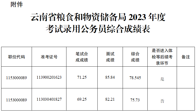 根據(jù)云南省2023年度考試錄用公務(wù)員工作安排,筆試、面試工作已經(jīng)結(jié)束,現(xiàn)將報(bào)考云南省糧食和物資儲(chǔ)備局公務(wù)員考生綜合成績(jī)及后續(xù)工作安排公告如下。