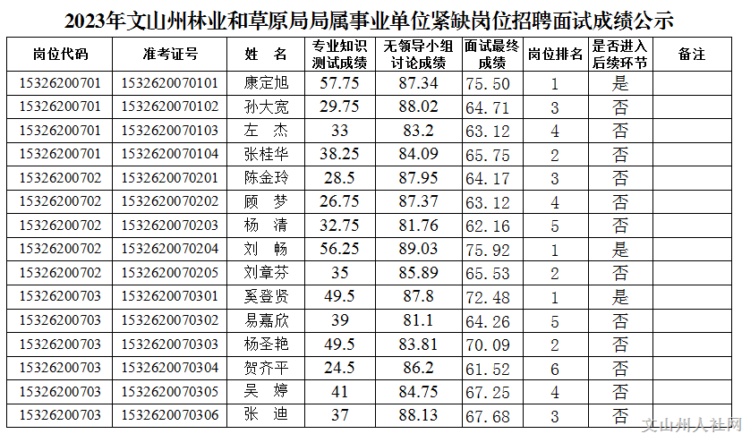2023年文山州林業(yè)和草原局局屬事業(yè)單位緊缺崗位招聘面試成績公示