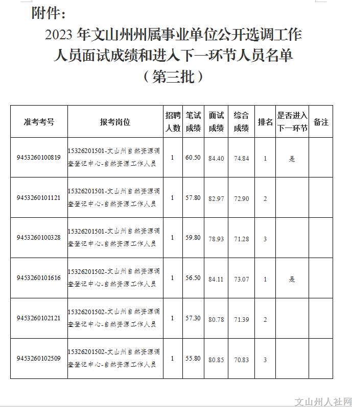 根據(jù)《2023年文山州州屬事業(yè)單位公開(kāi)選調(diào)工作人員通告》《2023年文山州州屬事業(yè)單位公開(kāi)選調(diào)工作人員筆試成績(jī)及資格復(fù)審有關(guān)事項(xiàng)通告》和《文山州自然資源和規(guī)劃局2023年事業(yè)單位公開(kāi)選調(diào)工作人員面試通告》的要求,文山州自然資源和規(guī)劃局于7月12日進(jìn)行了面試,現(xiàn)將面試成績(jī)和后續(xù)有關(guān)事項(xiàng)通告如下。