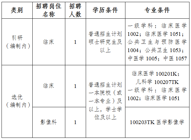 2.選優(yōu)崗位:普通招生計劃一本院校(或一本專業(yè))及以上學歷2022年、2023年、2024年優(yōu)秀畢業(yè)生或2022年、2023年、2024年取得住院醫(yī)師規(guī)范化培訓合格證,未在編在崗,在校期間總體成績優(yōu)異,所學專業(yè)必修科目無掛科。
