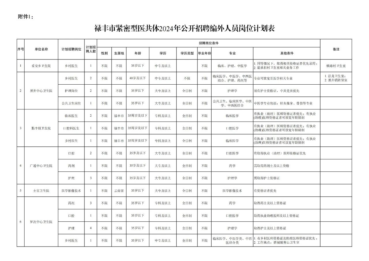1. 祿豐市緊密型醫(yī)共體2024年公開招聘編外人員崗位計劃表。