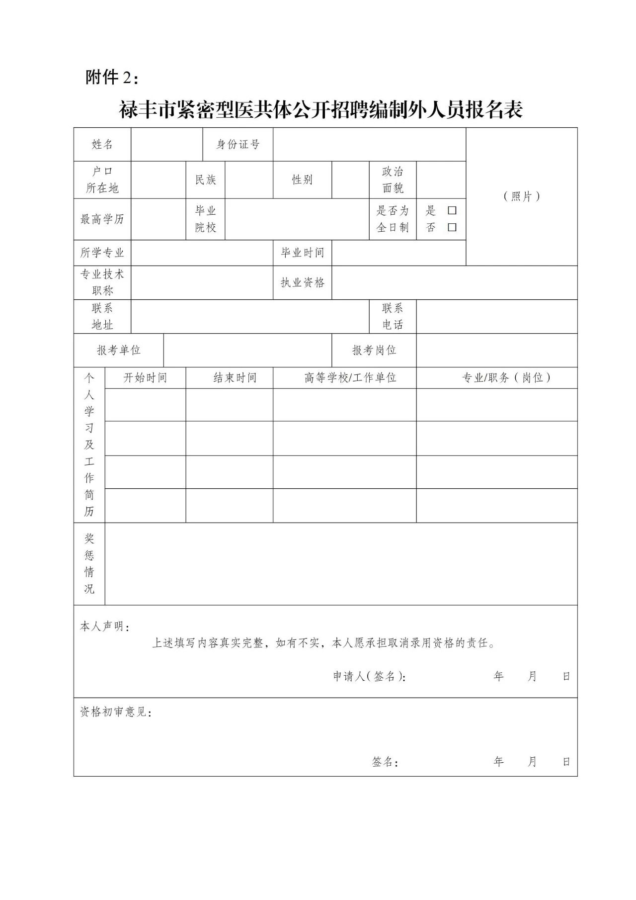 2. 祿豐市緊密型醫(yī)共體公開招聘編制外人員報名表。