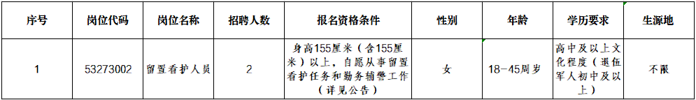 本次招聘的留置看護(hù)人員不具有人民警察和國(guó)家公務(wù)員身份,不納入編制管理,不行使人民警察職權(quán)。招聘人數(shù):2人(女性)。