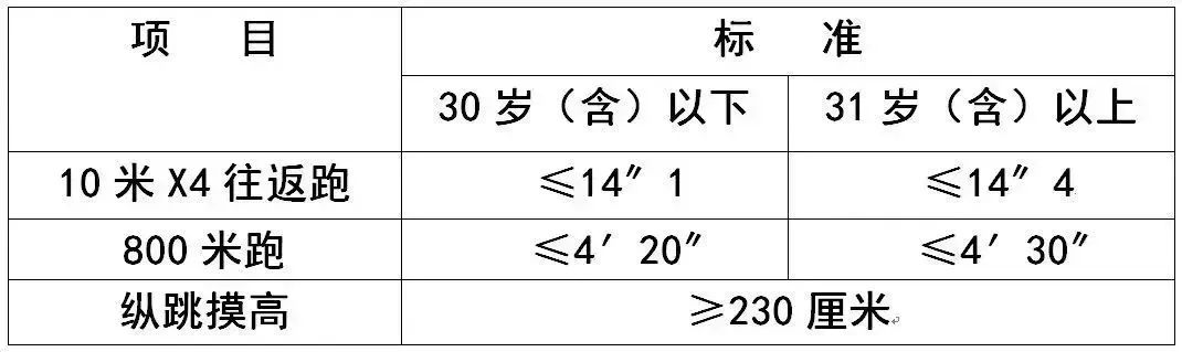 資格審核合格的人員進(jìn)入體能測(cè)試,體能測(cè)試按照公安部《關(guān)于印發(fā)公安機(jī)關(guān)錄用人民警察體能測(cè)評(píng)項(xiàng)目和標(biāo)準(zhǔn)(暫行)的通知》及其所附標(biāo)準(zhǔn)開(kāi)展。