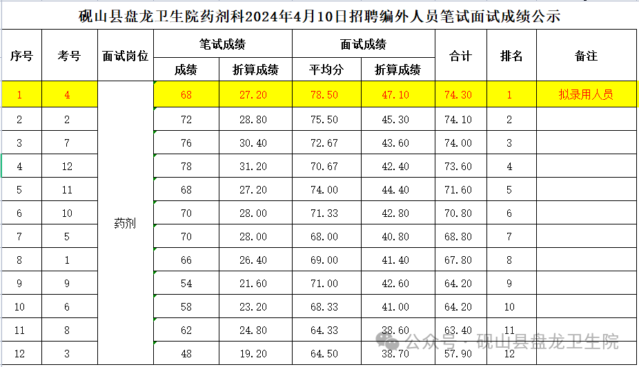 根據(jù)《硯山縣盤龍衛(wèi)生院公開(kāi)招聘專業(yè)技術(shù)人員公告》的有關(guān)要求,現(xiàn)對(duì)2024年4月7日公開(kāi)招聘考試的綜合成績(jī)公示如下:
