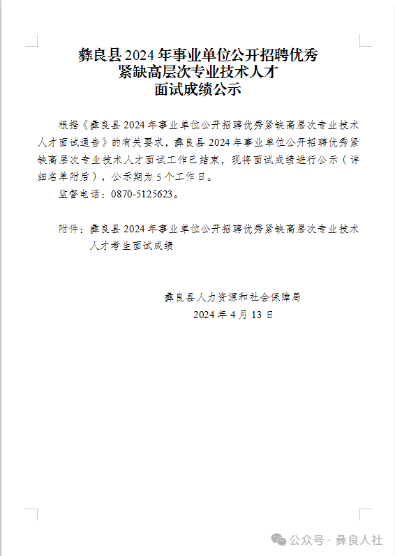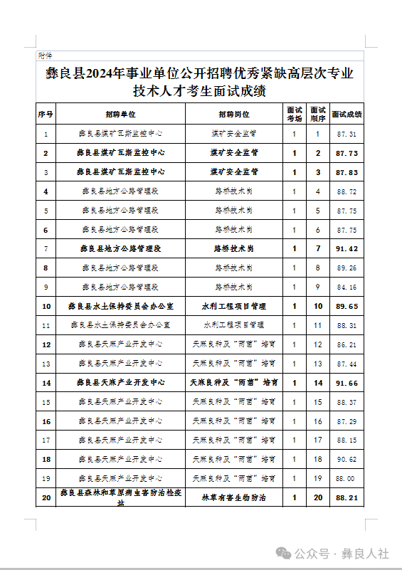 彝良縣2024年事業(yè)單位公開招聘優(yōu)秀緊缺高層次專業(yè)技術人才面試成績公示