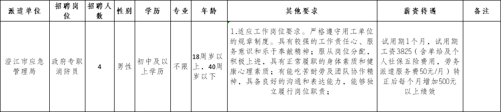 根據(jù)《澄江市應(yīng)急管理局勞務(wù)派遣人員招聘公告》要求已補充相應(yīng)崗位人員,現(xiàn)因部分崗位人員空缺,澄江市應(yīng)急管理局委托澄江市啟澄人力資源有限責(zé)任公司面向社會公開招聘勞務(wù)派遣人員4名,招聘相關(guān)事項如下:
