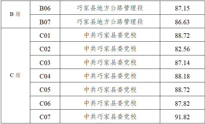 根據(jù)《昭通市2024年事業(yè)單位公開招聘優(yōu)秀緊缺專業(yè)技術(shù)人才實施辦法》和《巧家縣2024年事業(yè)單位公開招聘優(yōu)秀緊缺高層次專業(yè)技術(shù)人才通告》,巧家縣2024年事業(yè)單位公開招聘優(yōu)秀緊缺高層次專業(yè)技術(shù)人才面試工作已結(jié)束,現(xiàn)將面試成績予以公示,公示期為7個工作日。