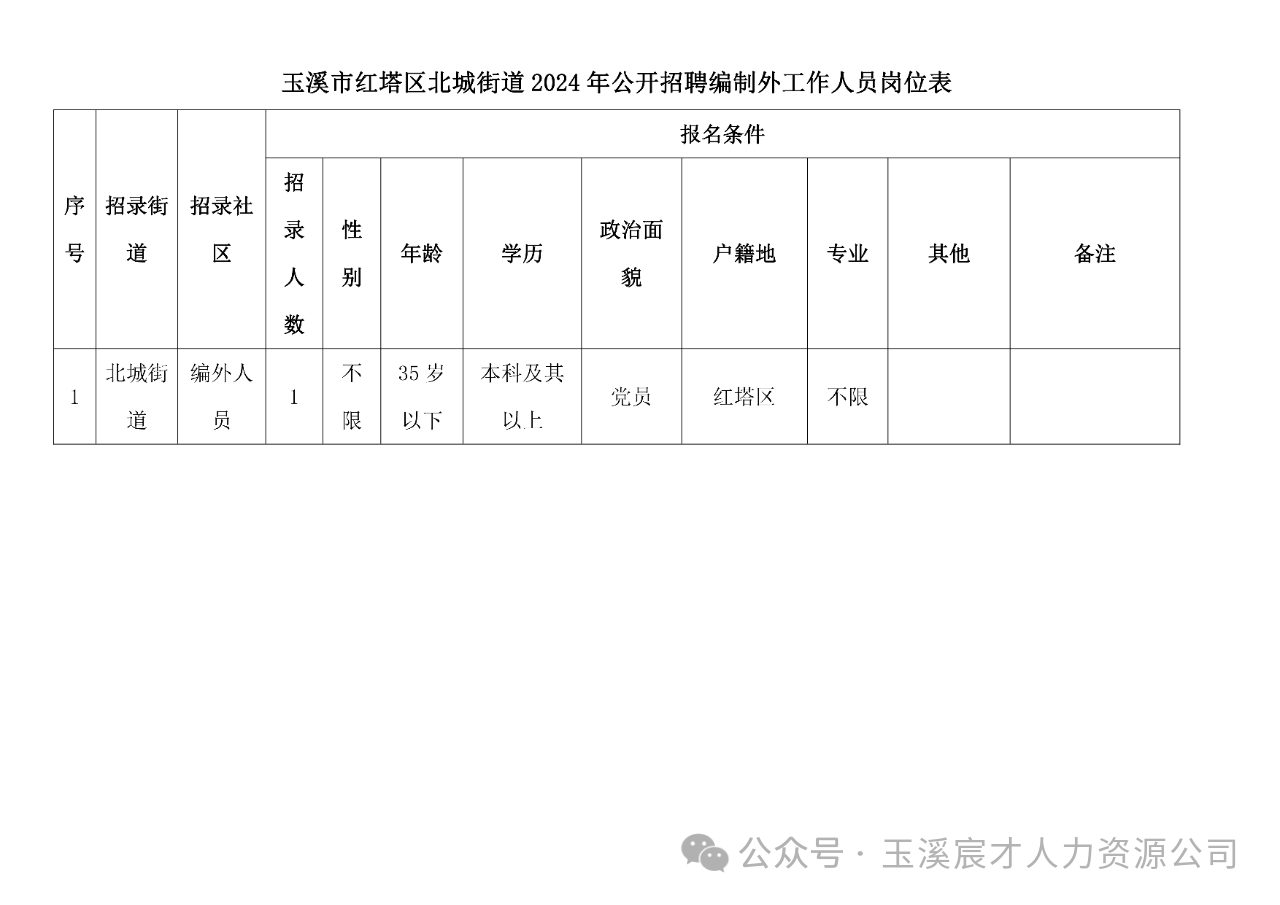 詳見《玉溪市紅塔區(qū)北城街道2024年公開招聘編制外工作人員崗位表》