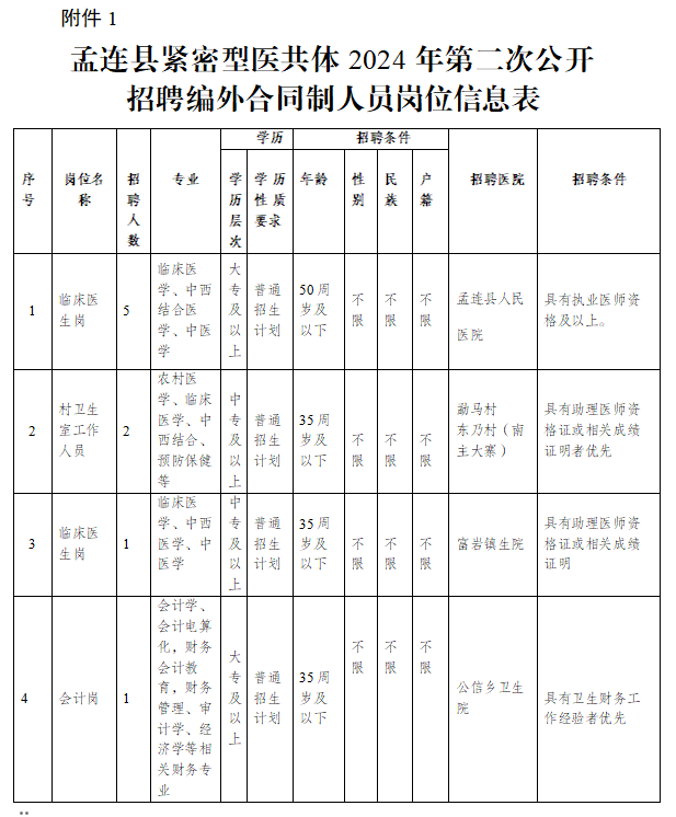 詳見《孟連縣緊密型醫(yī)共體2024年第二次公開招聘編外合同制人員崗位信息表》。