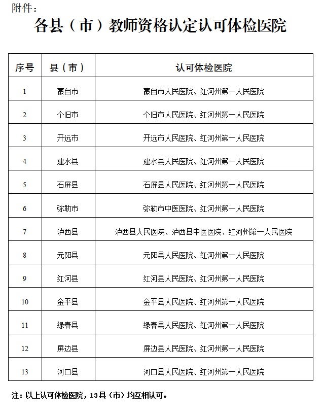 (四)能適應教育教學工作的需要,具有良好的身體素質(zhì)和心理素質(zhì)。申請人須按照《教育部教師資格認定指導中心關(guān)于調(diào)整申請認定幼兒園教師資格人員體檢標準的通知》(教資字〔2010〕15號)、《人力資源和社會保障部教育衛(wèi)生部關(guān)于進一步規(guī)范入學和就業(yè)體檢項目維護乙肝表面抗原攜帶者入學和就業(yè)權(quán)利的通知》(人社部發(fā)〔2010〕12號)、《云南省申請教師資格人員體檢辦法》(詳見省教育廳公告)要求,在教師資格認定機構(gòu)認可的縣級以上醫(yī)院體檢合格(紅河州認可醫(yī)院詳見附件)。