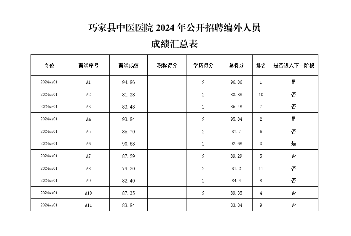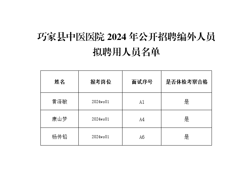 根據(jù)《巧家縣中醫(yī)醫(yī)院2024年公開招聘編外人員通告》(一號(hào))規(guī)定,巧家縣中醫(yī)醫(yī)院公開招聘編外人員面試、體檢、考察工作已經(jīng)結(jié)束?,F(xiàn)將總成績(jī)及擬聘用人員名單進(jìn)行公示(詳見附件)。