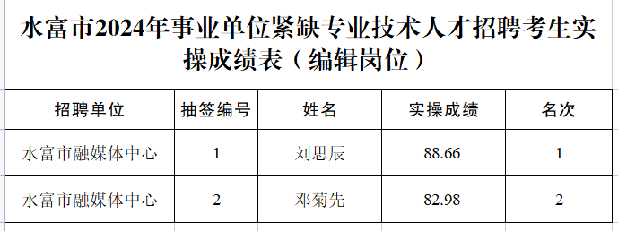 根據(jù)《昭通市2024年事業(yè)單位公開招聘優(yōu)秀緊缺專業(yè)技術人才實施辦法》和《水富市2024年事業(yè)單位公開招聘優(yōu)秀緊缺專業(yè)技術人才通告》的有關要求,水富市2024年事業(yè)單位公開招聘優(yōu)秀緊缺專業(yè)技術人才實操工作已于4月28日上午完成,現(xiàn)將實操成績予以公示,公示期為5個工作日。