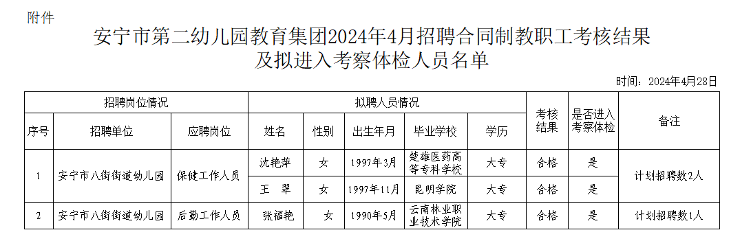 根據(jù)《安寧市第二幼兒園教育集團2024年4月招聘合同制教職工公告》要求,現(xiàn)將本次招聘3名擬進入考察體檢人員名單(見附件)予以公示。