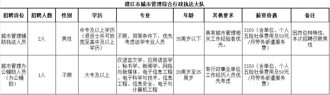 本次計劃公開招聘城市管理輔助執(zhí)法人員共3人(其中執(zhí)法隊隊員2人,辦公輔助1人)。報考人員在符合招聘基本條件基礎上,需符合崗位招聘條件,具體崗位及資格范圍條件詳見下表: