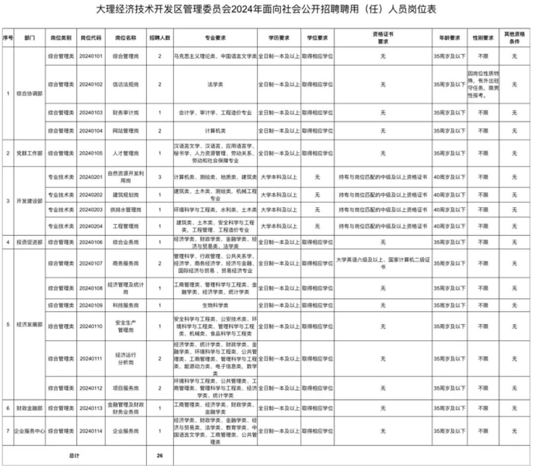 大理經濟技術開發(fā)區(qū)管理委員會面向社會公開招聘聘用(任)人員26人,招聘的具體崗位、資格條件等詳見《大理經濟技術開發(fā)區(qū)管理委員會2024年面向社會公開招聘聘用(任)人員崗位表》(附件)。