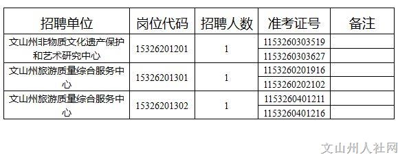 報(bào)考非物質(zhì)文化遺產(chǎn)保護(hù)和藝術(shù)研究中心、文山州旅游質(zhì)量綜合服務(wù)中心崗位,通過(guò)筆試并按開(kāi)考計(jì)劃數(shù)1:2的比例進(jìn)入資格復(fù)審且資格復(fù)審合格的人員確定為進(jìn)入面試人員,名單如下。