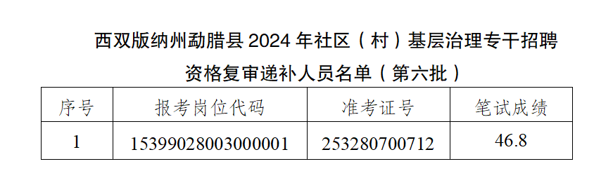 按照云南省2024年社區(qū)(村)基層治理專干招聘工作安排,因部分考生放棄或資格復(fù)審不合格,在筆試合格分?jǐn)?shù)線以上考生中,按成績由高到低順序進(jìn)行遞補(bǔ)?,F(xiàn)將西雙版納州勐臘縣關(guān)于云南省2024年社區(qū)(村)基層治理專干招聘資格復(fù)審遞補(bǔ)人員名單(第六批)予以公示。