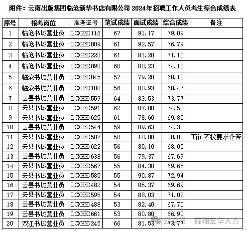 云南出版集團(tuán)所屬臨滄新華書(shū)店有限公司2024年公開(kāi)招聘工作人員綜合成績(jī)公示