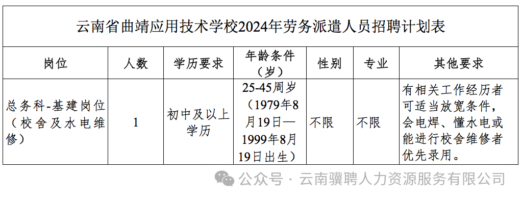 云南驥聘人力資源服務(wù)有限公司受云南省曲靖應(yīng)用技術(shù)學(xué)校委托,面向社會公開招聘勞務(wù)派遣人員1名。公司將按照勞務(wù)派遣的相關(guān)規(guī)定,結(jié)合用人單位工作實際要求,嚴格遵循“公開、平等、競爭、擇優(yōu)”的原則,嚴格考核、擇優(yōu)聘用,現(xiàn)將有關(guān)事項公告如下:
