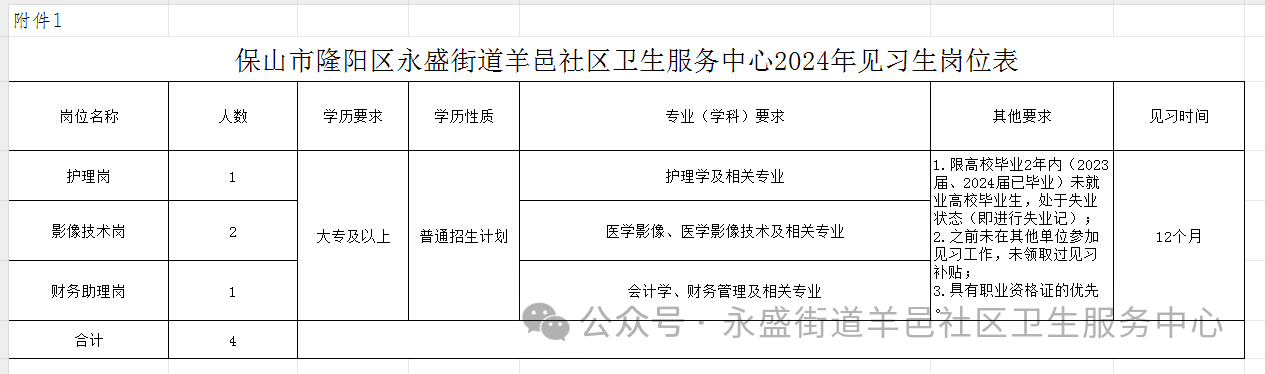 本次招聘見習生4人,其中:護理崗1人;影像技術崗2人;財務助理崗1人;。詳見附件1:《保山市隆陽區(qū)永盛街道羊邑社區(qū)衛(wèi)生服務中心2024年見習生崗位表》。