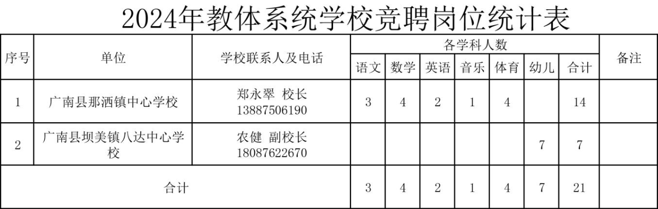 按照廣南縣“縣管校聘”的相關(guān)文件要求,為滿足學(xué)校教育教學(xué)工作需要,廣南縣那灑鎮(zhèn)中心學(xué)校、八達(dá)中心學(xué)校決定對(duì)教師空缺崗位面向全縣鄉(xiāng)鎮(zhèn)各學(xué)校落聘教師公開(kāi)競(jìng)聘,具體崗位如下: