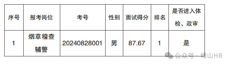 根據(jù)《峨山彝族自治縣公安局公開招聘警務輔助人員公告》,通過報名、資格審查、面試,現(xiàn)將成績予以公示,并將進入下一環(huán)節(jié)—體檢、政審人員名單進行公示如下: