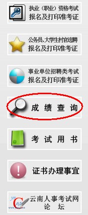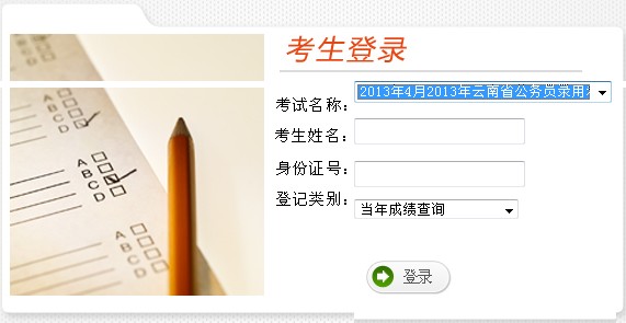 登錄報(bào)名網(wǎng)站云南人事考試網(wǎng),網(wǎng)址為:www.ynrsksw.cn、www.ynrsksw.net或www.ynrsksw.com(登錄任意一個(gè)網(wǎng)址均可查詢)。如下圖所示,在首頁的右側(cè)點(diǎn)擊“成績(jī)查詢”,選擇2013年公務(wù)員考試,在“登記類別”欄選擇“當(dāng)年成績(jī)查詢”,輸入“考生姓名”及“身份證號(hào)”,即可查詢本人各科的詳細(xì)成績(jī)。