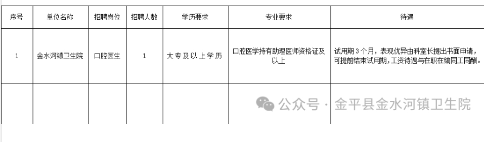 金平縣金水河鎮(zhèn)衛(wèi)生院招聘口腔醫(yī)生