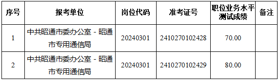 中共昭通市委辦公室公開選調(diào)昭通市專用通信局通信工程建設(shè)及運(yùn)行維護(hù)職位(20240301)職業(yè)素質(zhì)測評工作已經(jīng)結(jié)束,根據(jù)《中共昭通市委辦公室2024年公開選調(diào)工作人員職業(yè)素質(zhì)測評公告》,現(xiàn)將測評成績予以公布: