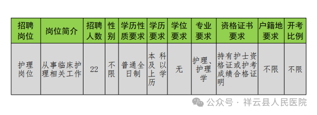 因工作需要,祥云縣人民醫(yī)院面向社會公開招聘護理崗位人員,現(xiàn)將有關(guān)事項通告如下: