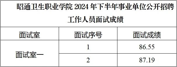 根據(jù)《昭通市2024年下半年事業(yè)單位公開招聘工作人員通告(第一號)》《昭通衛(wèi)生職業(yè)學(xué)院2024年下半年事業(yè)單位公開招聘工作人員資格審核及面試通告》,昭通衛(wèi)生職業(yè)學(xué)院已按要求完成2024年下半年事業(yè)單位公開招聘工作人員面試工作,現(xiàn)將面試成績予以公布。
