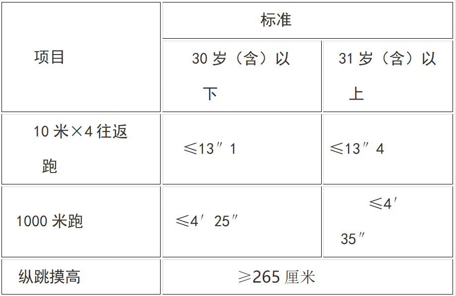 備注:綜合管理、執(zhí)法勤務(wù)職位測(cè)查全部3個(gè)項(xiàng)目,警務(wù)技術(shù)職位免予測(cè)查1000米(男)/800米(女)跑項(xiàng)目;對(duì)專業(yè)人才緊缺難以形成競(jìng)爭(zhēng)的特殊職位,經(jīng)省級(jí)以上公務(wù)員主管部門(mén)同意,可以適當(dāng)放寬體能測(cè)評(píng)有關(guān)項(xiàng)目標(biāo)準(zhǔn)或者免予測(cè)查體能測(cè)評(píng)項(xiàng)目;凡應(yīng)測(cè)項(xiàng)目中任意一項(xiàng)不達(dá)標(biāo)的,即為體能測(cè)評(píng)不合格。年齡計(jì)算時(shí)間截止到參加體能測(cè)評(píng)當(dāng)月。
