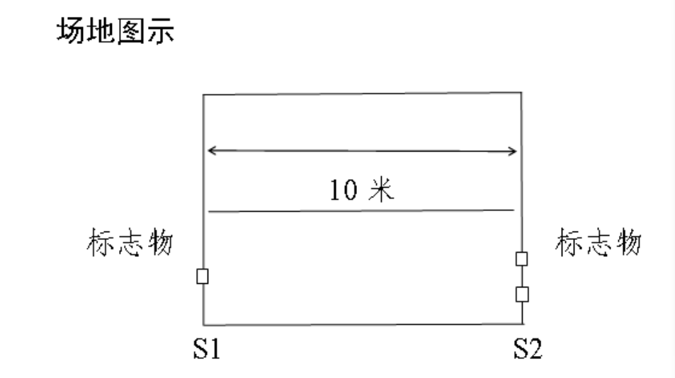 動(dòng)作要求:受測(cè)試者采用站立式起跑,聽(tīng)到發(fā)令后從S1線外跑到S2線前(腳不得踩線)用手將豎立的木塊推倒后折返,往返跑2次,每次推倒1個(gè)木塊,第2次返回時(shí)沖出S1線。