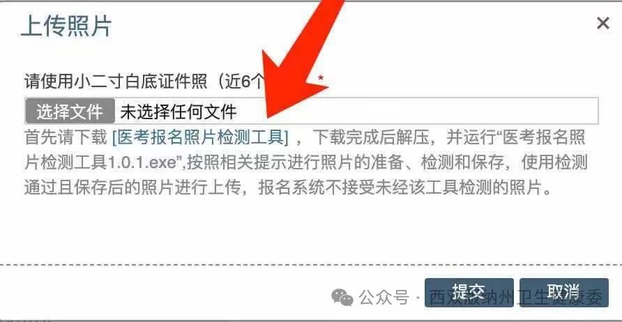 (四)報名照片:考生網(wǎng)上報名前,先按要求準(zhǔn)備近期6個月內(nèi)正面免冠小2寸白底證件數(shù)碼彩色證件照(照片必須清晰,亮度足夠,頭像占照片的2/3,露眉露耳,jpg/jpeg格式)。需按照系統(tǒng)提示內(nèi)容下載并運行“醫(yī)考報名照片檢測工具”(如圖),網(wǎng)報系統(tǒng)只接受經(jīng)該工具檢測通過且保存后的照片進行上傳,照片不符合要求的,不予進行資格審核。請廣大考生提前準(zhǔn)備,以免影響考試報名。