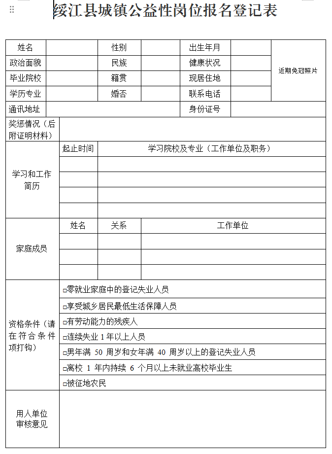 附件:綏江縣城鎮(zhèn)公益性崗位報名登記表