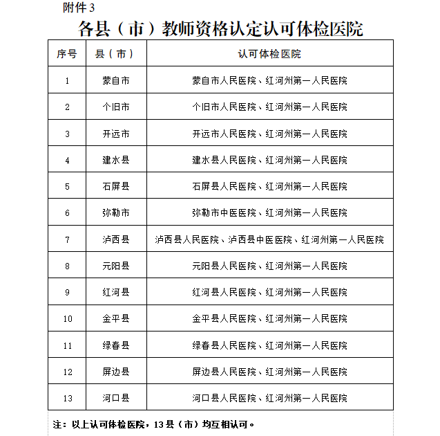 (7)《云南省申請教師資格認定人員體檢表》原件(見附件1)。經(jīng)紅河州轄區(qū)內(nèi)縣級以上公立醫(yī)院體檢后(認可體檢醫(yī)院詳見附件2),體檢結(jié)論簽署 “合格”且有體檢醫(yī)院意見并加蓋公章的《云南省教師資格認定體檢表》原件,體檢報告僅限當次認定有效。